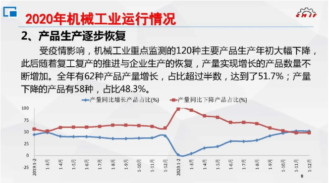 年初受疫情影響,機械工業重點監測的120種主要產品生產大幅下降,1~2月僅2種產品產量實現增長。此后隨著復工復產的推進與企業生產的恢復,產品產量實現增長的品種數不斷增加。全年產量增長的產品有62種,占比超過半數,達到了51.7%;產量下降的產品有58種,占比48.3%。