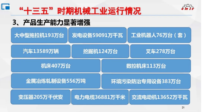 “十三五”期間,機械工業累計生產大中型拖拉機193萬臺、發電設備59091萬千瓦、工業機器人76萬臺(套)、汽車13589萬輛、挖掘機124萬臺、叉車278萬臺、機床407萬臺、其中數控機床113萬臺、環境污染防治專用設備383萬臺、金屬冶煉軋制設備556萬噸、變壓器205萬千伏安、交流電動機13652萬千瓦、電力電纜36881萬千米,為國民經濟各行業提供了充足的設備供應與保障。
